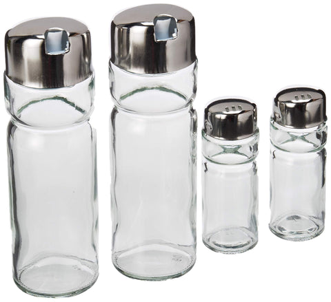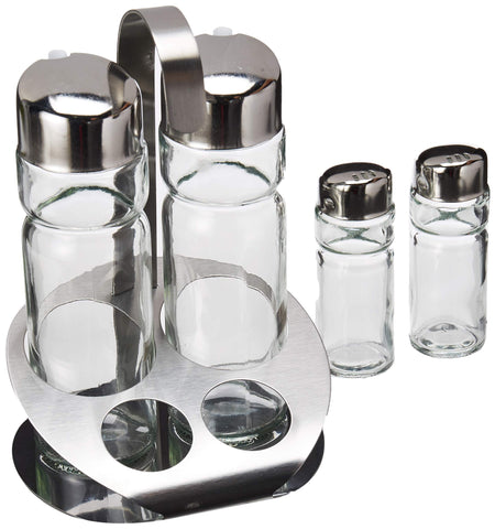 Contiene 1 salero 40 ml, 1 pimentero 40 ml, 2 vinagreros 170 ml y 1 rack.